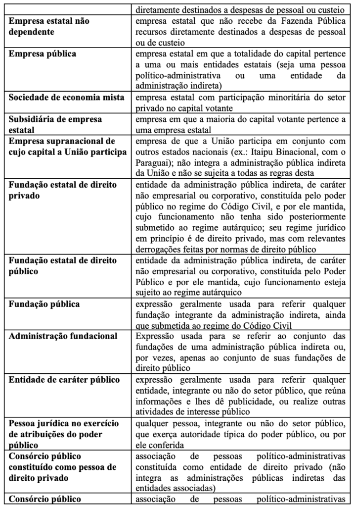 O quadro abaixo, além de sintetizar parte das informações que você já conhece, acrescenta muitas outras, retiradas da Constituição, da legislação ou da prática. Tudo bem resumido. Elas ajudam você a navegar com facilidade pelas normas constitucionais e legais sobre o regime jurídico básico das diversas entidades estatais. Leia-as com cuidado para facilitar a compreensão das normas da Lei Federal de Processo Administrativo e da Constituição, que virão a seguir.
